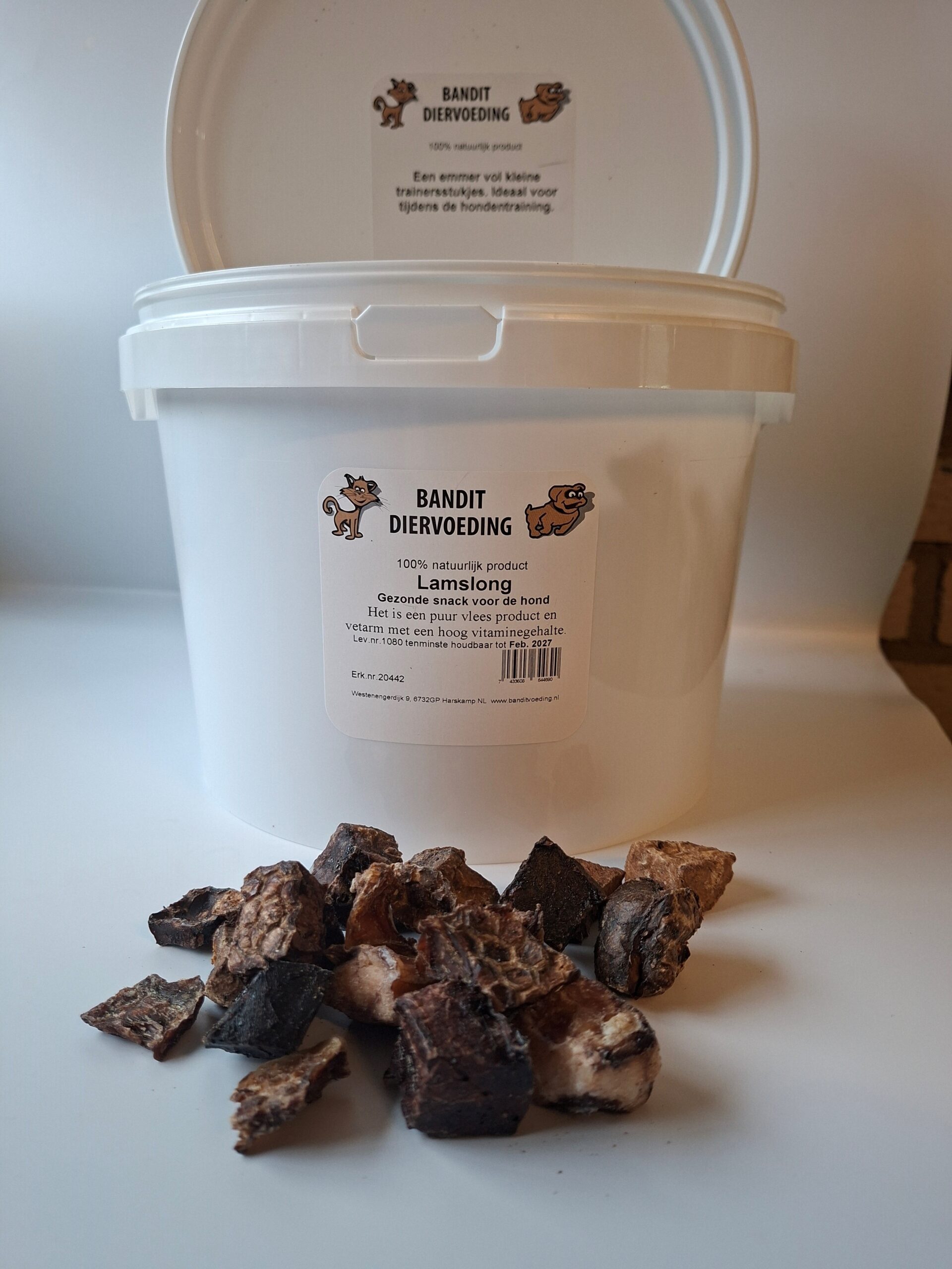 Een emmer vol gedroogde lamslong voor de hond. Puur lam en vetarm.