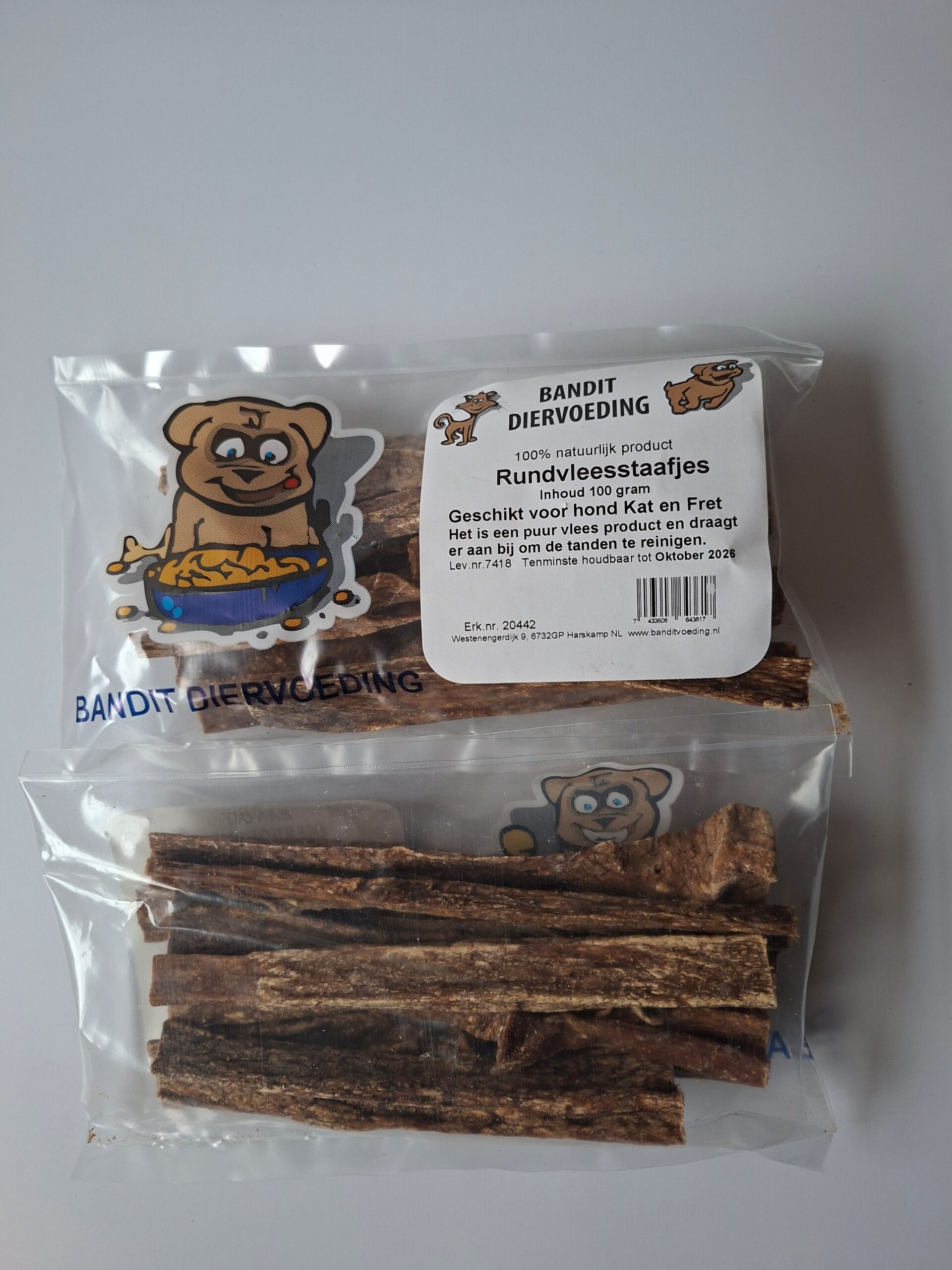 Geschikt voor hond, kat en fret. Puur vlees product draagt bij om de tanden te reinigen, inhoud 100 gram
